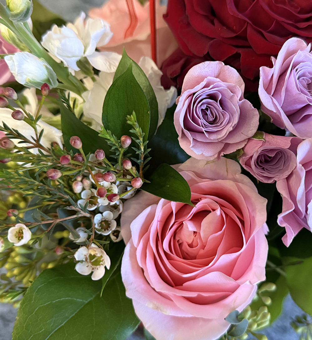 Designer's Choice: Roses, spray roses, snapdragons, stock, wax flowers, lisianthus, hydrangea, tulips, mixed greens, Valentine accent